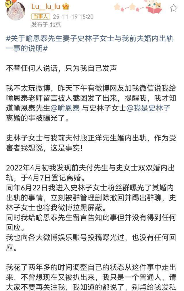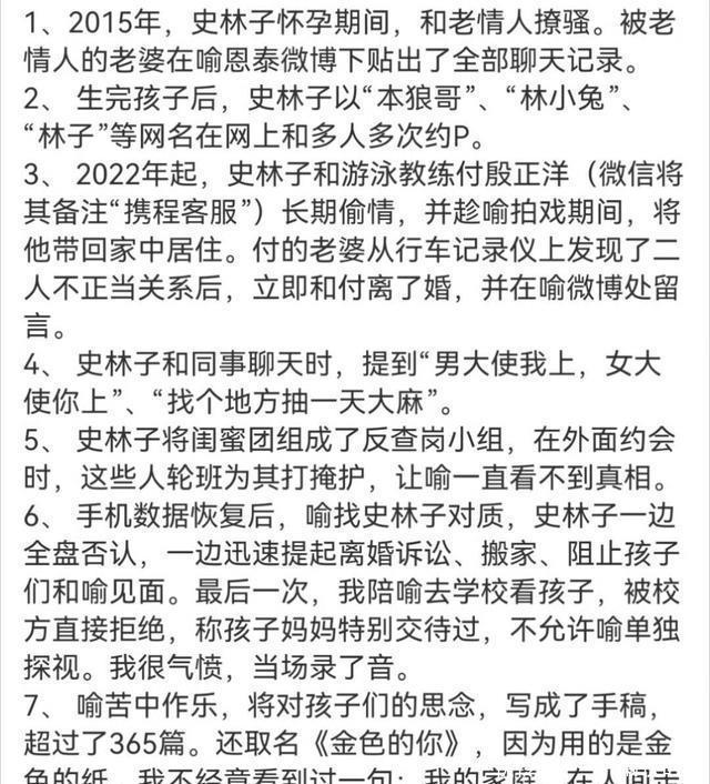 紧接着,喻恩泰和史林子的共同好友也站出来爆料,称史林子从2015年结婚开始,就频频婚内出轨,甚至怀孕期间都不消停,生完孩子后更是变本加厉,不仅把情人带回家,还组建“闺蜜反查岗小组”打掩护。